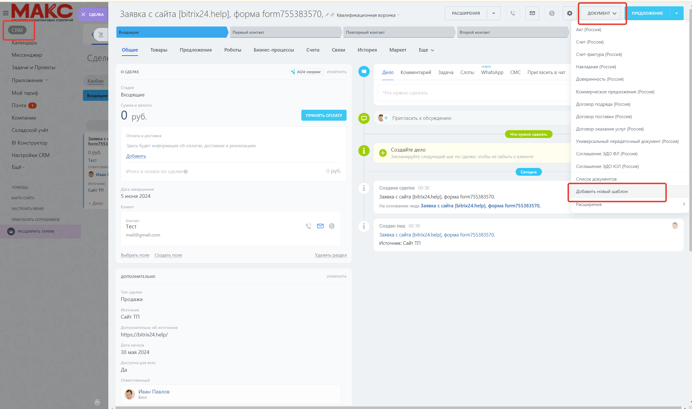 Войдите в ваш аккаунт Битрикс24. Перейдите в раздел CRM. В верхнем меню выберите «Документы». Выберите пункт «Добавить новый шаблон». Загрузите подготовленный шаблон документа.